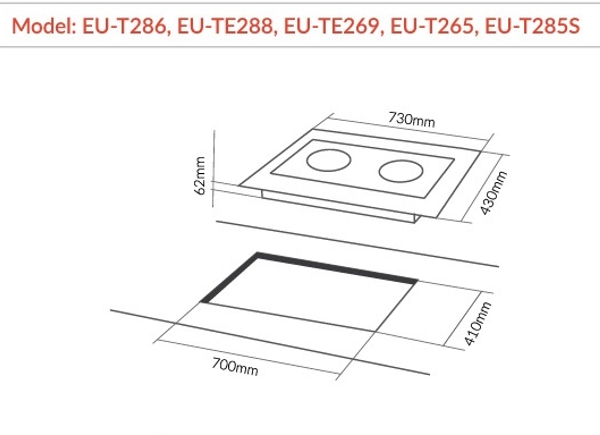 - Kích thước mặt bếp: 730R * 430S * 62C