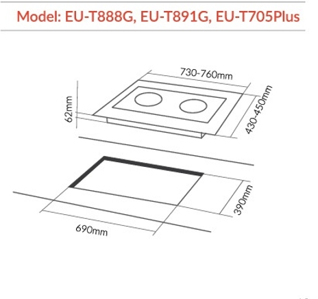- Kích thước mặt bếp: 760R * 450S * 60C