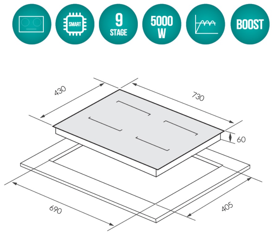 • 2 vùng nấu từ riêng biệt với công suất tối đa 2500W: