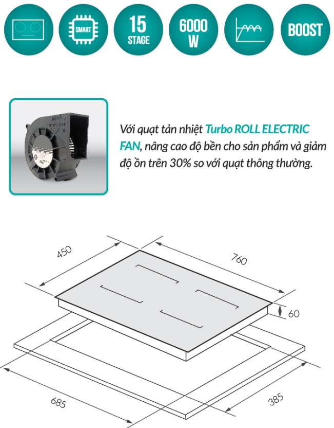 • Chức năng Booster tăng công suất lên đến 3000W mỗi vùng, đẩy nhanh tốc độ nấu, tiết kiệm thời gian.