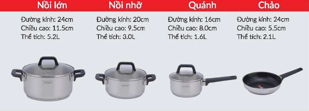 Nồi lớn: R24*H11.5cm + Thể tích: 5.2L