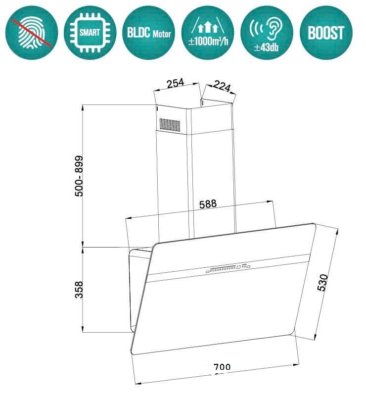Công suất hút mạnh mẽ: Đạt ±1000m³/h, loại bỏ hiệu quả khói và mùi khó chịu, giữ cho không khí bếp luôn tươi mới.