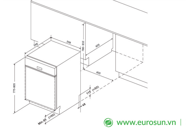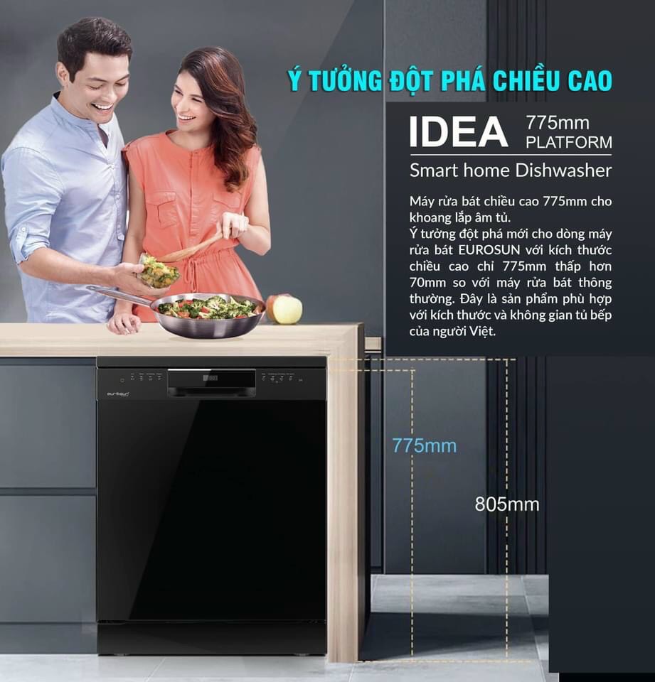 Máy rửa bát Eurosun SMS78EU12EB nhập khẩu nguyên chiếc từ Thái Lan với thiết kế sang trọng cùng công suất rửa 13+ bộ bát đĩa, an toàn, bền bỉ và tiết kiệm năng lượng